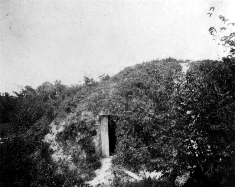 The two heavy guns were mounted outside the fortification. Behind the guns was the earth mound, or bunker, which encased a wooden room in the center to house the magazine.