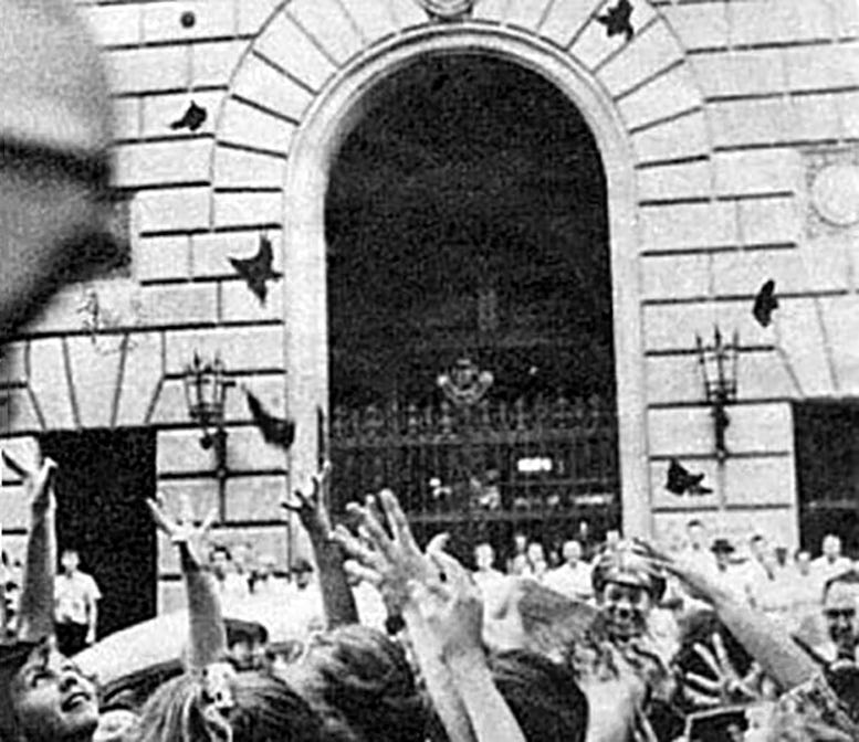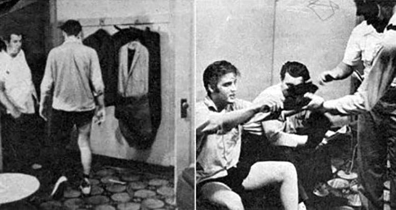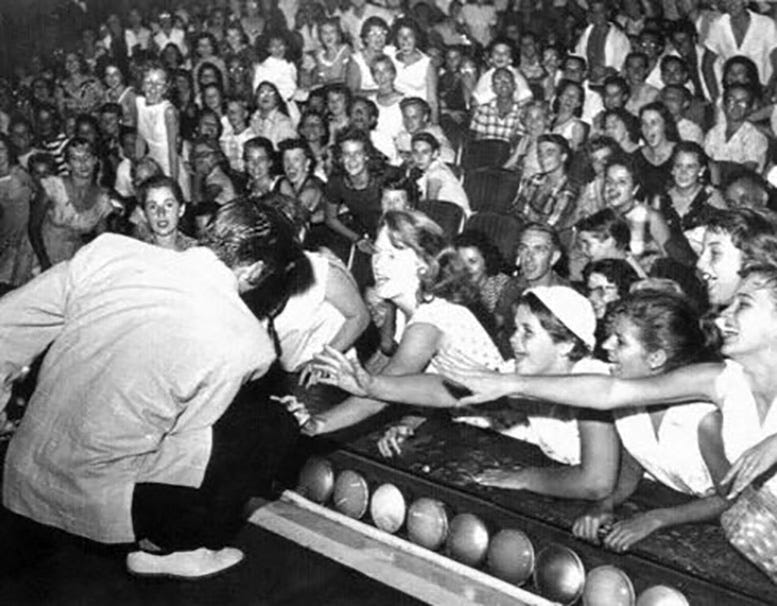 Between performances, Elvis cut up the damaged pants himself and stepped out onto a landing on the fire escape, tossing bits of the fabric down to the screaming fans waiting in line for the next show along SE Second Avenue. Although just a small sample of fabric from his pants, the crowd fought for the opportunity to capture a keepsake from the rising star entertainer.