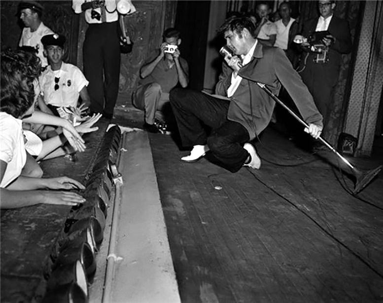 Elvis Presley was scheduled to take the stage for his first show at the Olympia Theater at 3:30 p.m. on Friday, August 3rd. Around 4 p.m., he finally appeared, dressed in a lavender jacket, black pants, and white shoes, and the crowd erupted. The energy in the theater surged the moment Elvis launched into his signature dance moves, sending fans into a frenzy.