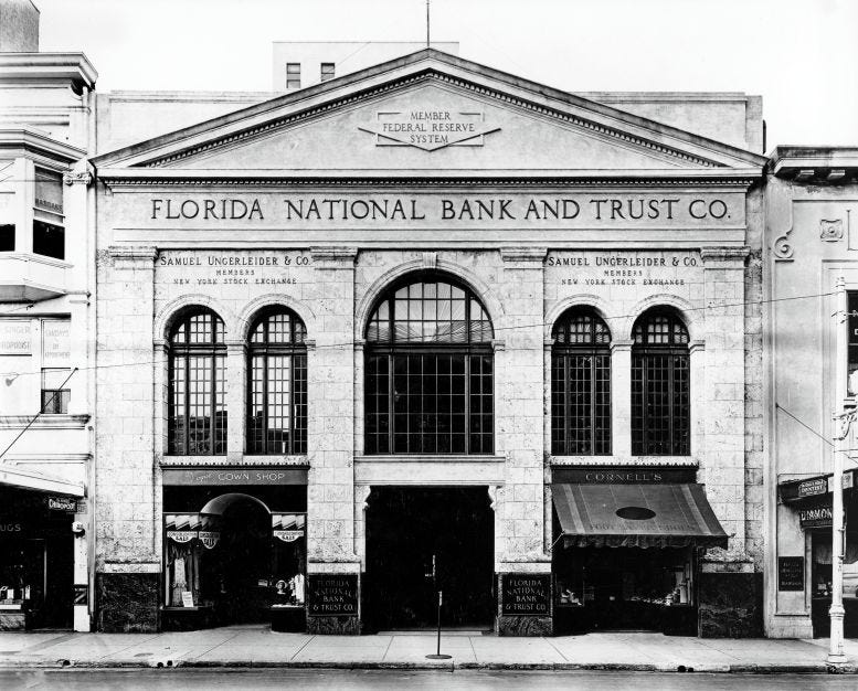 The Florida National Bank & Trust, owned by Alfred I Dupont, opened at 118 East Flagler Street in downtown Miami on Monday, August 17, 1931, in the former location of City National Bank.
