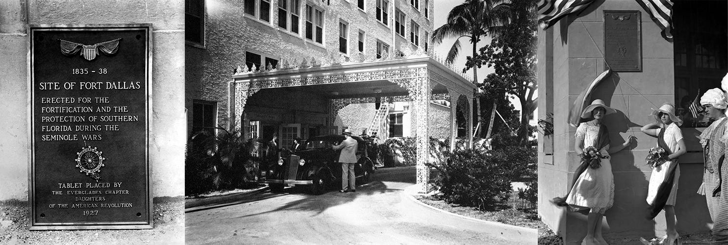 In addition to donating the barracks building to be preserved, R.C. Hogue also agreed to allow for a bronze plaque to be placed onto the Robert Clay Hotel to commemorate the former location of Fort Dallas. In a ceremony that took place on February 22, 1927, on Washington’s birthday, the Daughters of the Revolution (DAR), unveiled the marker affixed to the hotel near the building’s entrance during an event that featured Mary Brickell, granddaughter of William and Mary, as part of the event to reveal the bronze tablet.