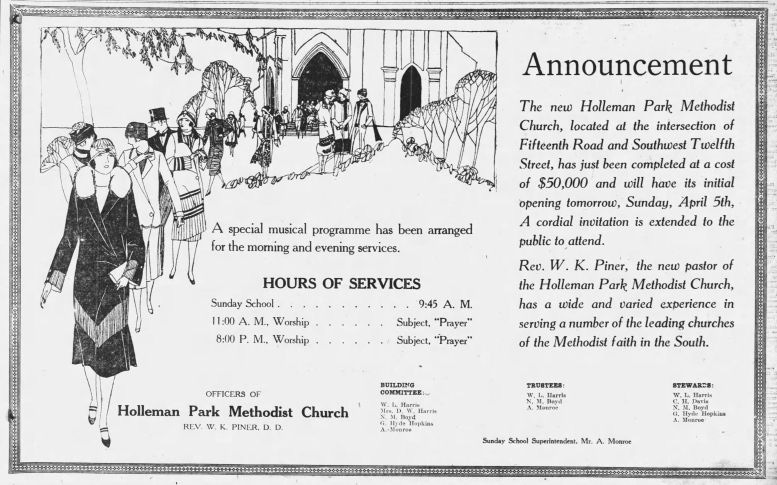 Reverend W. K. Piner, who had been appointed pastor in January 1925, oversaw the final stages of construction and the church’s move into its new home. His parsonage, a residence provided by the congregation, was completed that July, just a short distance away on SW Eleventh Street. Shortly after settling into the new sanctuary, the congregation officially changed its name from the Southside Methodist Church to the Holleman Park Methodist Church, reflecting its new home within the Holleman Park subdivision.