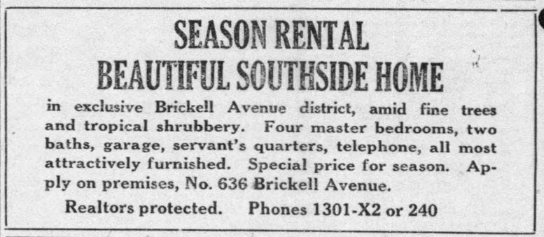 The cottage at 1816 Brickell Avenue, later renumbered 636 Brickell in 1920, was constructed in February 1911. The residence featured five master bedrooms, two bathrooms, servants’ quarters, and a spacious garage. Early newspaper advertisements described the property as being “amid fine trees and tropical shrubbery,” emphasizing its lush, landscaped surroundings. Built by Thomas McGahey as an investment, the home served as a comfortable retreat for many of Miami’s distinguished visitors during the city’s early years.