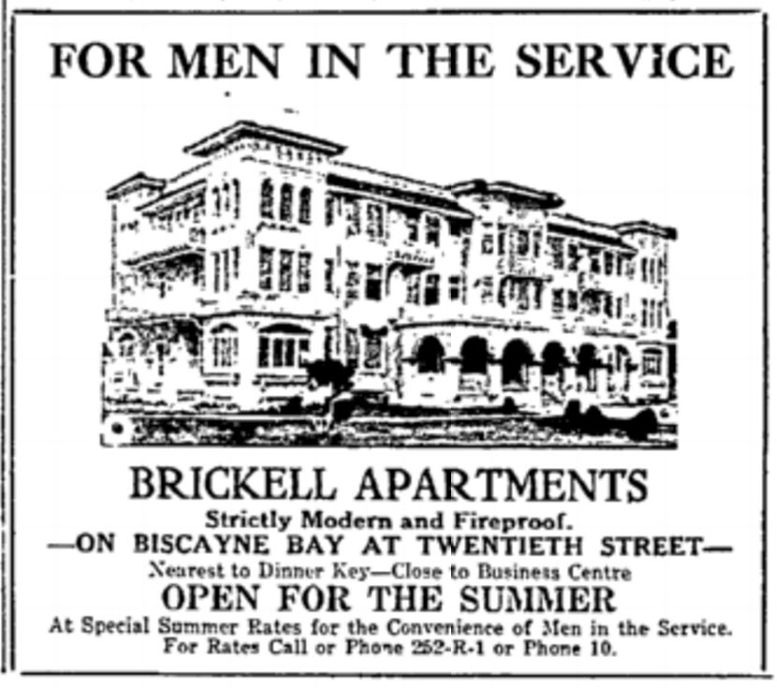 Toward the end of World War I in 1918, Charles Brickell advertised the apartments in the Miami Herald to returning veterans. Many soldiers had trained in Miami before deploying overseas and returned with favorable memories of the city, contributing to a surge in population after the war.