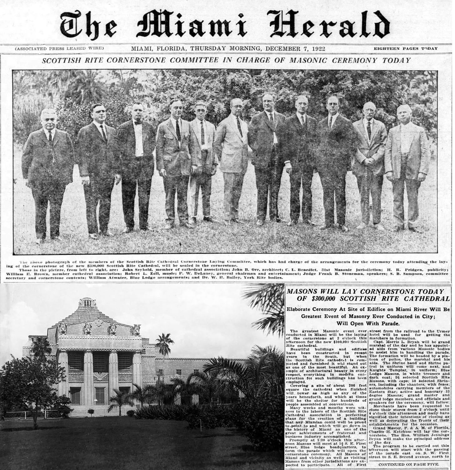On December 7, 1922, the cornerstone was laid for the Scottish Rites temple at 471 NW Third Street near Lummus Park in downtown Miami.